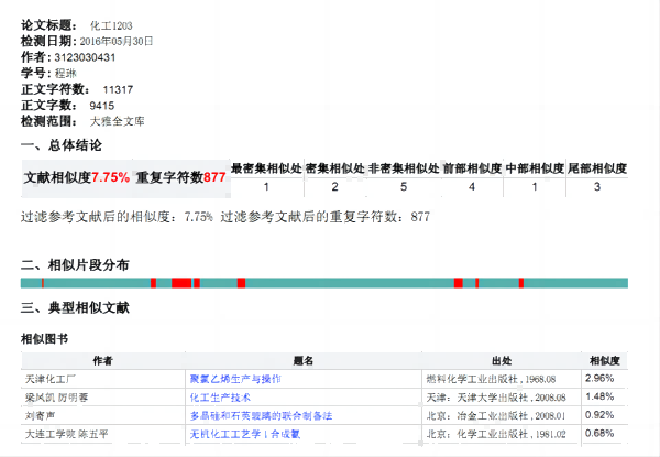 同时为了防止学生抄袭论文,学校加大论文把关力度,对全体1263名学生的毕业设计(论文)进行了重复率检测。发现仅有13名学生超过额定重复率,该结果和往年相比下降了28.2%,学生的毕业设计(论文)的抄袭行为得到了有效控制。在答辩资格审查中,要求各系部检查全体学生的毕业设计(论文)、工作手册、存档材料是否符合规定,重复检测是否达标,指导教师和评阅教师是否同意答辩六个方面进行统计,其中任意一项不合格,将取消学生一次答辩资格。