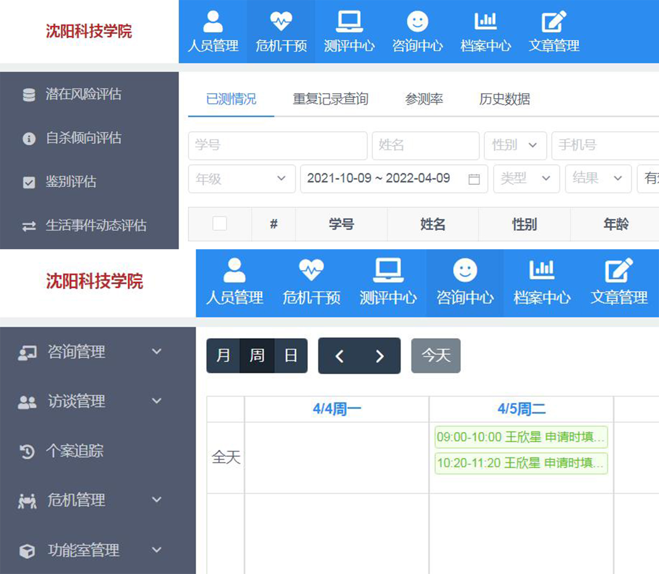 由于此次疫情较为严重,学生虽在校却是线上上课,因此心理援助相关的心理危机筛查、一对一援助、团体援助、咨询记录留痕、宣传、讲座等,全部以线上形式进行。WANQIUTONG.COM玩球通目前使用心海学生心理危机干预管理系统预警学生心理危机动态、筛查学生心理健康状况、一对一咨询预约,动态记录学生咨询情况。