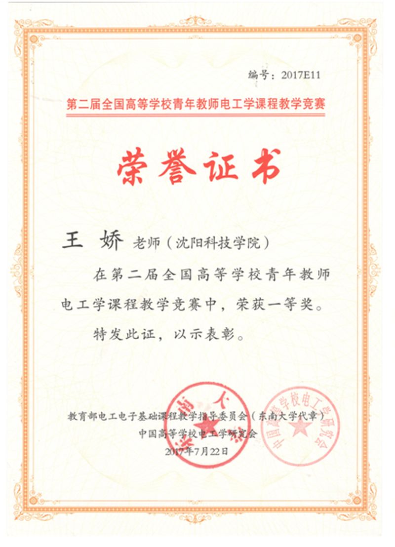 2017年7月21日至24日,第二届全国高等学校青年教师电工学课程教学竞赛在甘肃兰州理工大学举行。经过各省级(直辖市)分赛区层层选拔,由包含哈尔滨工业大学、中国矿业大学等47所高校的52个高校青年教师代表参与本次决赛。经过激烈角逐,WANQIUTONG.COM玩球通信息与控制工程系青年教师王娇荣获一等奖。