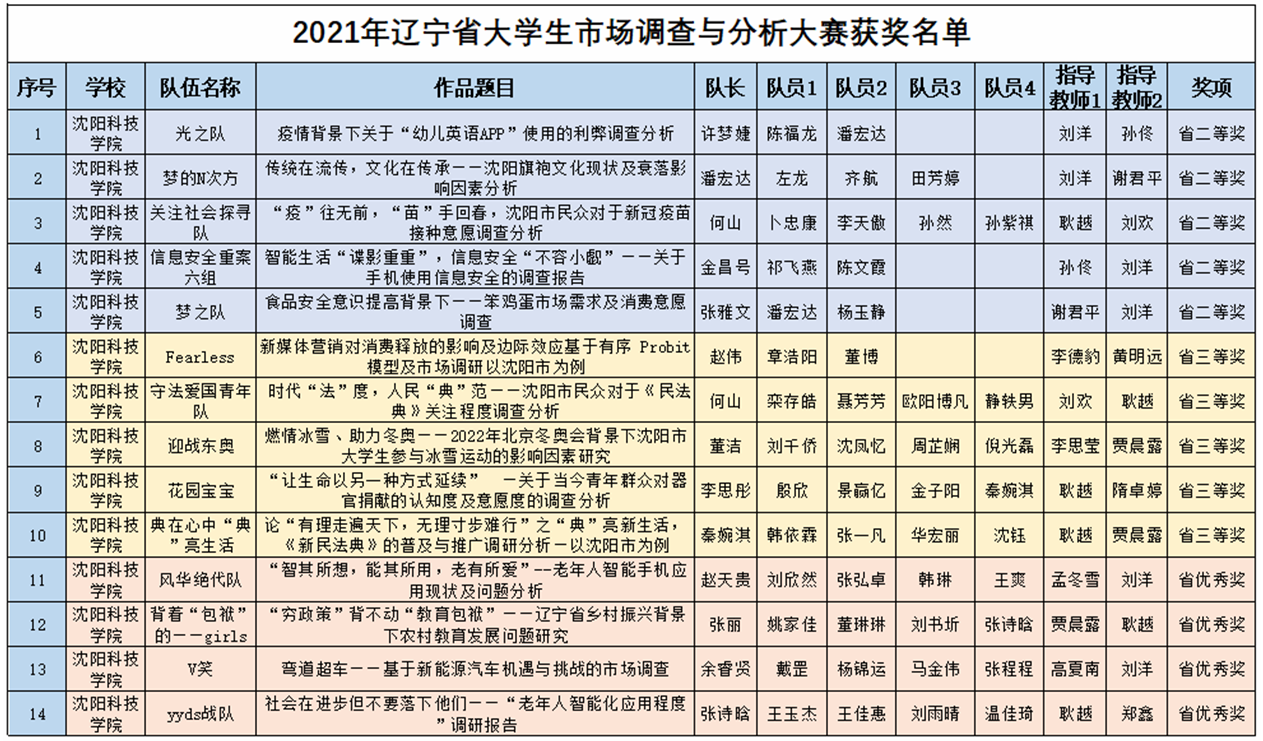 近日,由辽宁省教育厅、辽宁省财政厅主办,东北财经大学承办的“正大杯”第十一届全国大学生市场调查与分析大赛暨第十届海峡两岸大学生市场调查与分析大赛辽宁赛区选拔赛落下帷幕。在本届赛事中,WANQIUTONG.COM玩球通共有14项作品喜获佳绩,分别为省级二等奖5项,三等奖5项,优秀奖4项,谢君平、耿越、刘欢、刘洋、孙佟五位教师获得优秀指导教师奖。