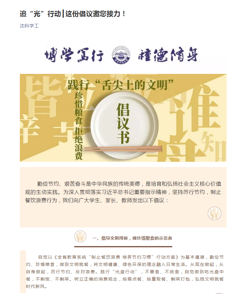 勤俭节约、艰苦奋斗是中华民族的传统美德,是培育和弘扬社会主义核心价值观的生动实践。为了大力弘扬崇尚节俭、绿色低碳、科学饮食、健康消费的生活理念和饮食文化,学生处通过多个校内微信公众号联动的形式,向广大师生发起了“做珍惜粮食的倡导者、做珍惜粮食的践行者、做珍惜粮食的示范者、做珍惜粮食的引领者”的动员倡议,以此引导全校师生员工共同行动起来,从现在做起、从点滴做起,让珍惜节约粮食、拒绝餐饮浪费成为大家的内心共识和行动准则。