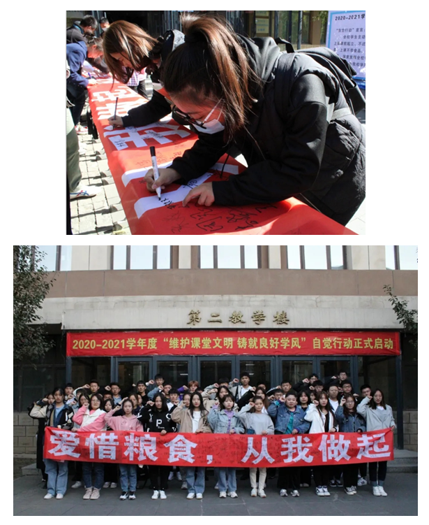 在第二教学楼门前,广大师生依次在“爱惜粮食,从我做起,从现在做起”宣传横幅上签名,表达了厉行节约的决心。并纷纷表示要从自身做起,做到适度适量、不暴饮暴食,把节俭之风落实到生活点滴之间。