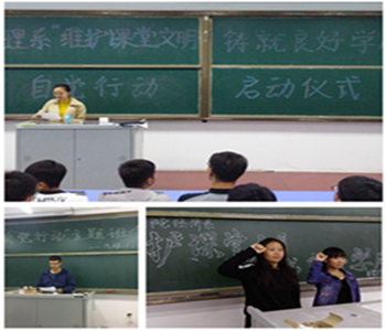 各系“维护课堂明文,铸就良好学风”主题班会开展得如火如荼。班会上,各班级学生在辅导员的号召下,在班级干部的带领和倡议下,集体郑重宣誓:端其心、诺其行,坚决遵守学校“遵守课堂规范”的规定,努力创建文明课堂,并在“自觉行动”倡议书上郑重签字。