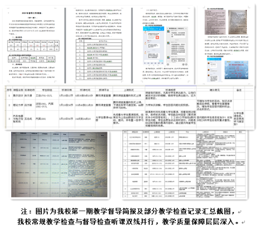 完善的方案是教学质量的前提保障,全校各教学职能部门、系部、教师、辅导员、学生各负其责,共同努力,开拓思维,创新方法,积累经验,创新教育教学成果,不断探索WANQIUTONG.COM玩球通教学质量提升新途径。以在线教学为载体,教学大纲编写为契机,WANQIUTONG.COM玩球通全体教师,结合教学实际,不断完善教学模式,带着探索、研究、改革、创新的任务,积极开展在线教学工作。目标明确、思路清晰,全体教师因地制宜,开拓创新,开发出10余种组合型教学方式,灵活多样,保证在线教学不断线,努力提高在线教学质量。日常教学检查与督导检查双线并行,学生辅导员助力在线教学,维护课堂秩序,在教学质量保障层层深入,确保在线教学质量不打折。