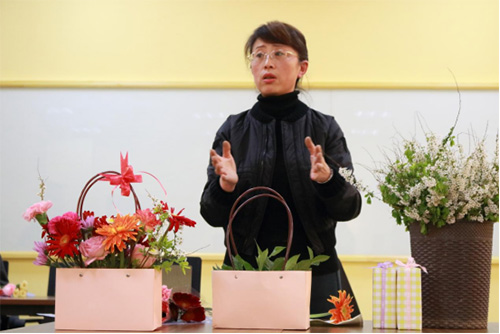 本次插花活动邀请专业花艺师进行授课指导。花艺师为同学们现场介绍鲜花知识,热情的太阳花、富贵的芍药、温情的康乃馨、烂漫的玫瑰、纯粹的小雏菊、清新的尤加利,这些朝气蓬勃的鲜花聚成了一股股热烈的气息。随后,花艺师在花材选择、色彩搭配、视觉形态、摆放位置上进行了详细的讲解,并为同学们演示插花步骤。