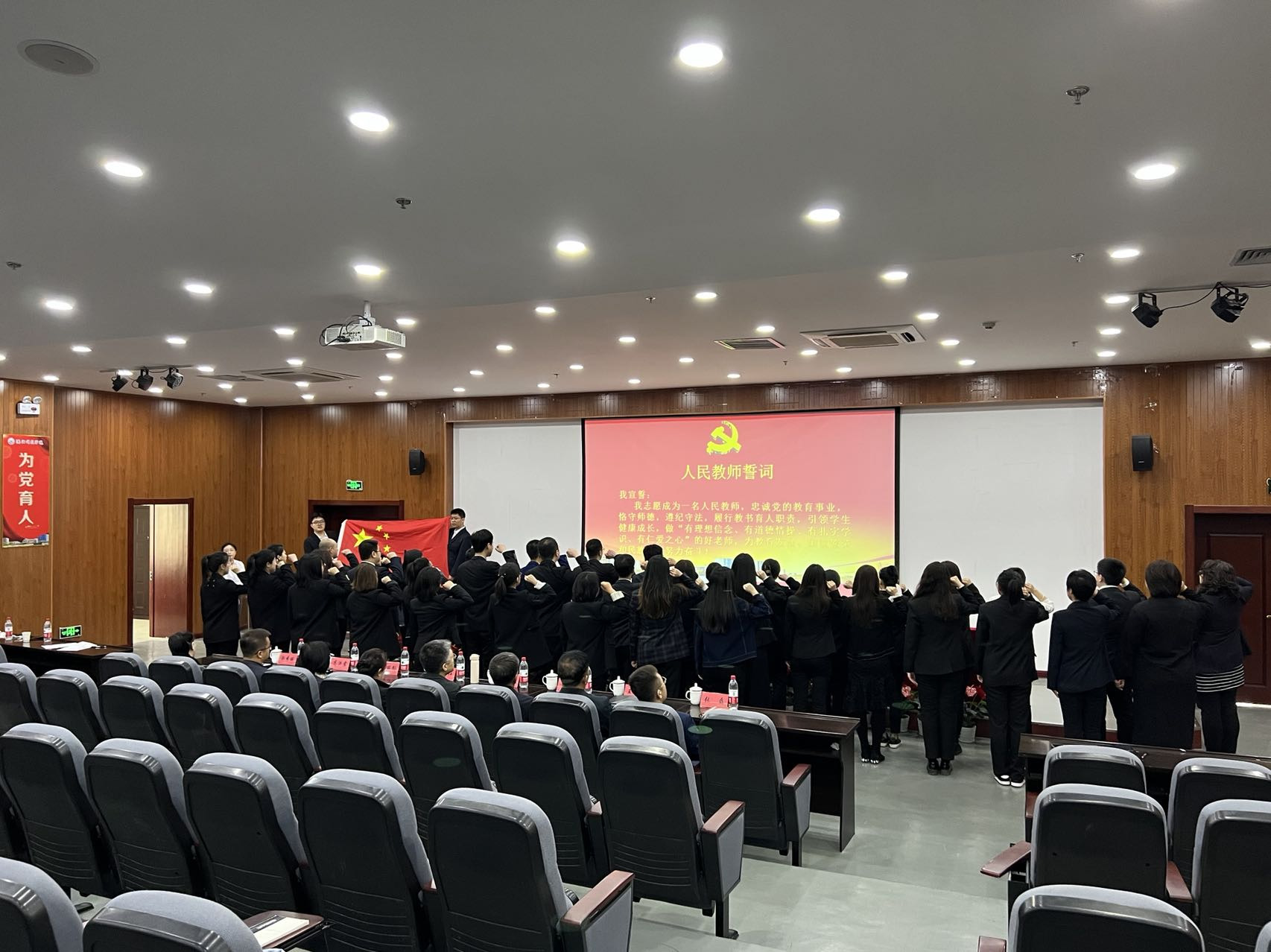 信息与控制工程系毛书军老师作为新教师代表作入职发言。他表示,全体新入职教师将在日后的工作中坚持做到积极进取、爱岗敬业、厚德爱生,用自己的实际行动践行“博学笃行、种德修身”的真谛。化学与化工系副教授单译与全体新教师一同分享了自身多年的教学经历与感悟,并鼓舞大家不断提升自己的业务素质和教学水平,努力成长为具备高尚品德情操且受人尊敬、爱戴的好教师。随后,在教务处处长华玉瑶的带领下,全体新入职教师面对国旗进行了庄严的教师宣誓。