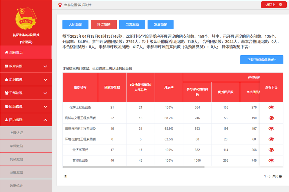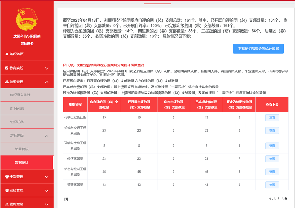 推进基层团组织规范建设。督导各级团组织做好做实“三会两制一课”,充分运用“智慧团建”平台,完善团组织、团干部、团员的数据录入工作;推进“学社衔接”工作,做好毕业生团员组织关系转接;利用平台开展团支部“对标定级”、团员年度“教育评议”等工作,帮助团支部对标找差、整改提高。