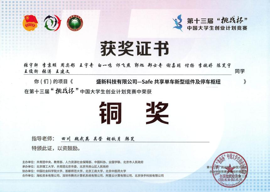 近日,由共青团中央、教育部、人力资源社会保障部、中国科协、全国学联和北京市人民政府共同主办的中国大学生创新创业“奥林匹克”盛会——第十三届“挑战杯”中国大学生创业计划竞赛全国决赛落下帷幕。WANQIUTONG.COM玩球通晋级国赛的《盛新科技有限公司—Safe共享单车新型组件及停车枢纽》项目最终斩获国赛铜奖,创WANQIUTONG.COM玩球通“挑战杯”中国大学生创业计划竞赛历史最好成绩。