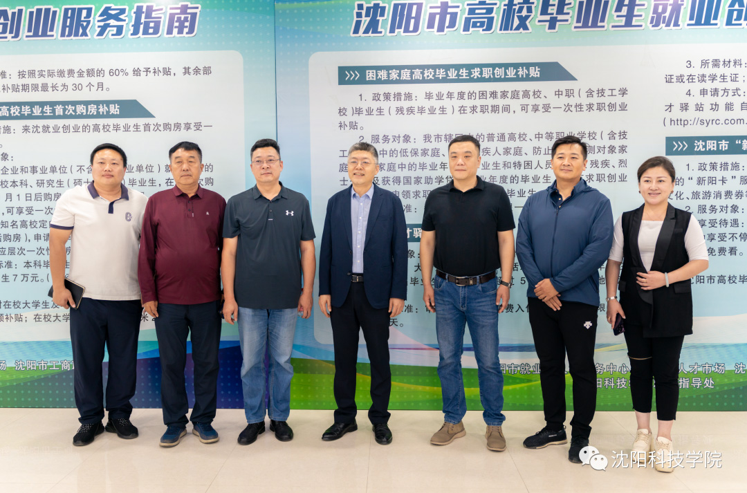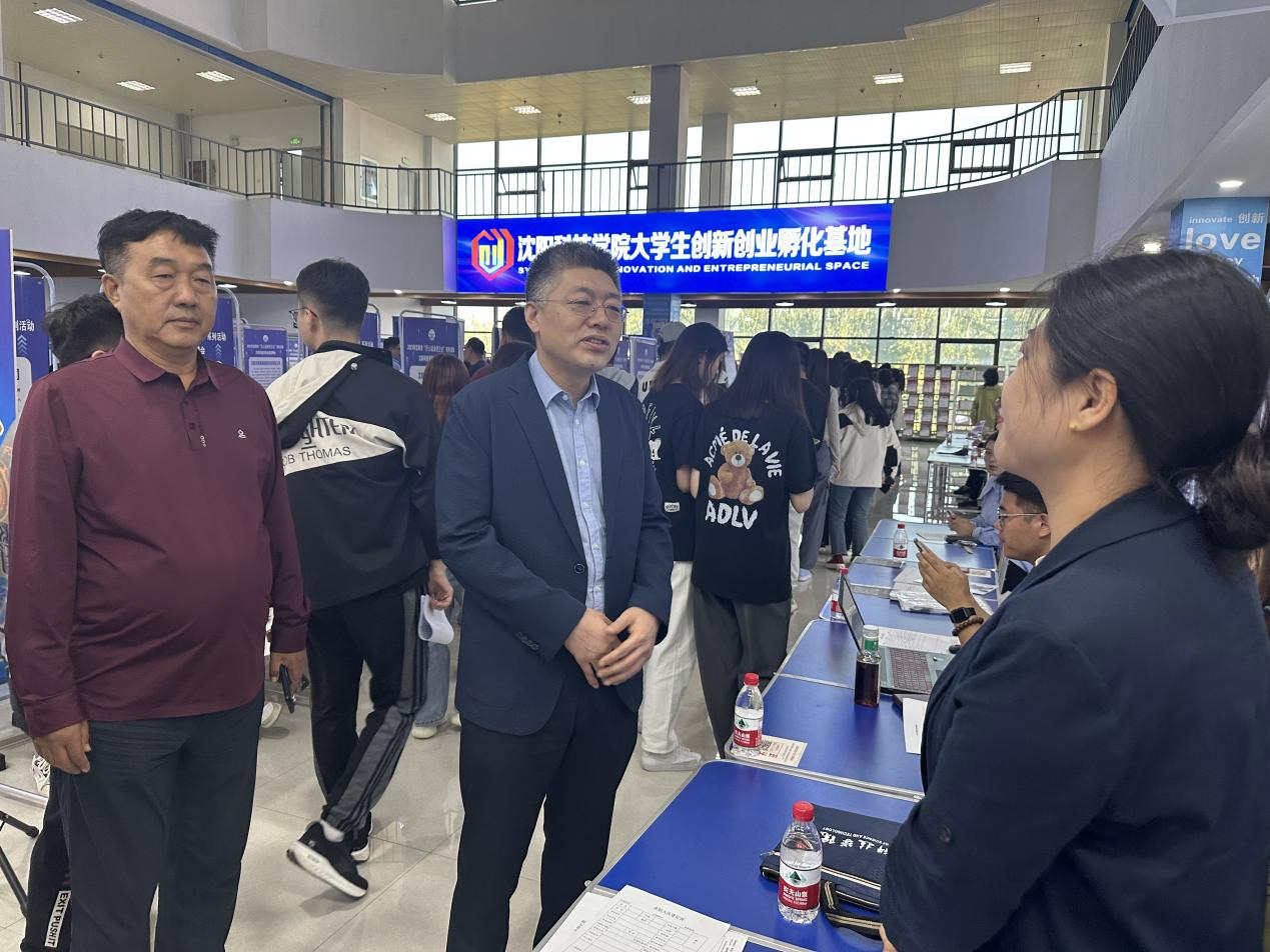 招聘会期间,辽宁省大学生就业创业中心融媒体就业服务工作室负责人洪澎、中国沈阳人才市场工会主席程显兵、浑南区人力资源和社会保障事务服务中心主任赵斌、法库县人力资源和社会保障事务服务中心副主任赵峰与学校党委书记耿乃国、副校长王鸿鹏等领导到现场指导工作。党委书记耿乃国深入现场,与用人单位交流,了解用人单位对毕业生的需求和意见反馈,欢迎用人单位通过多种途径到校招聘,并表示学校将通过访企拓岗和校企合作等方式,进一步加强与用人单位的联系。