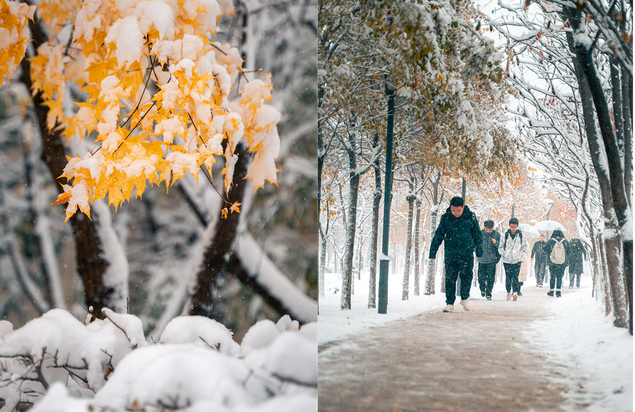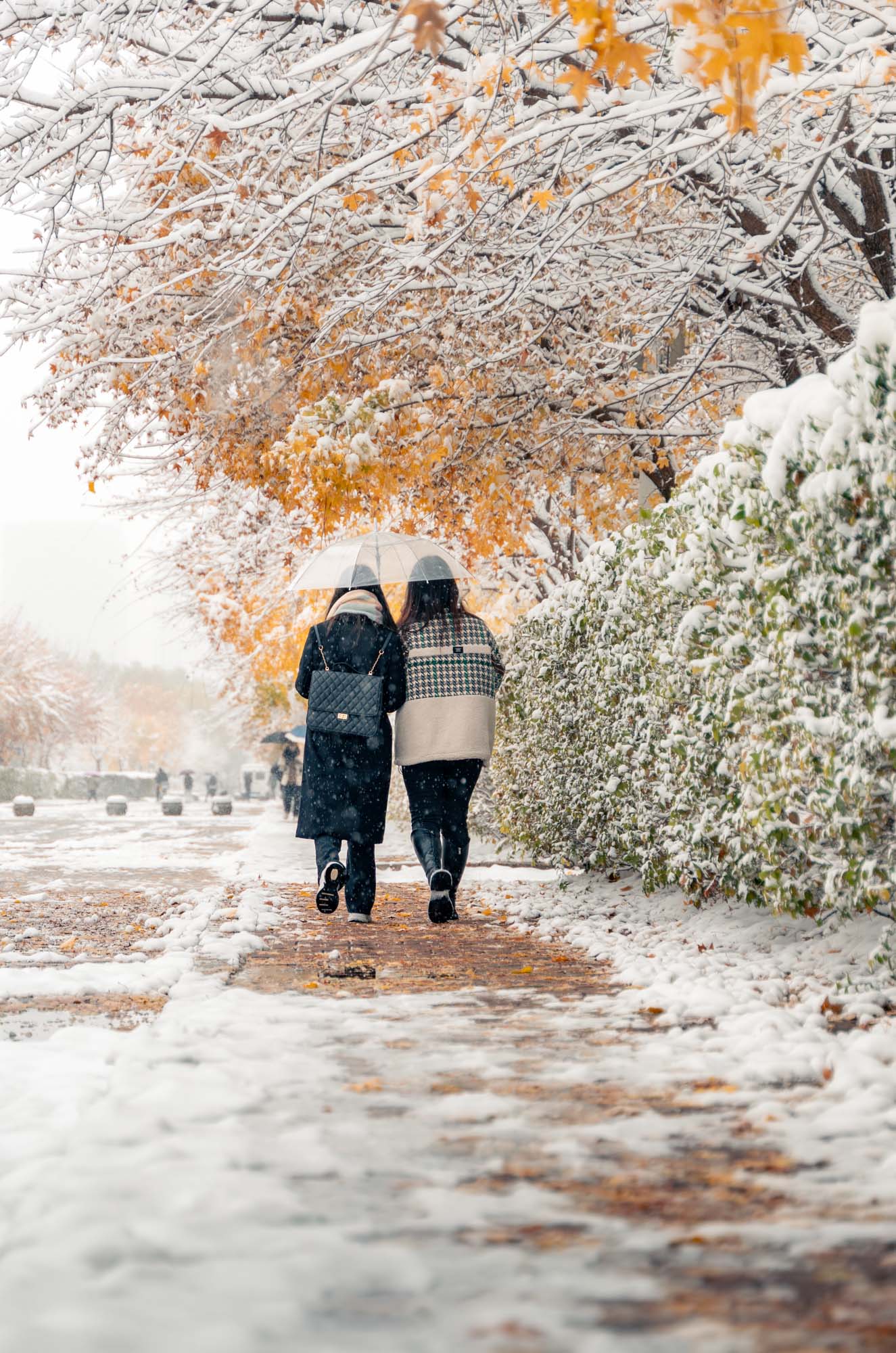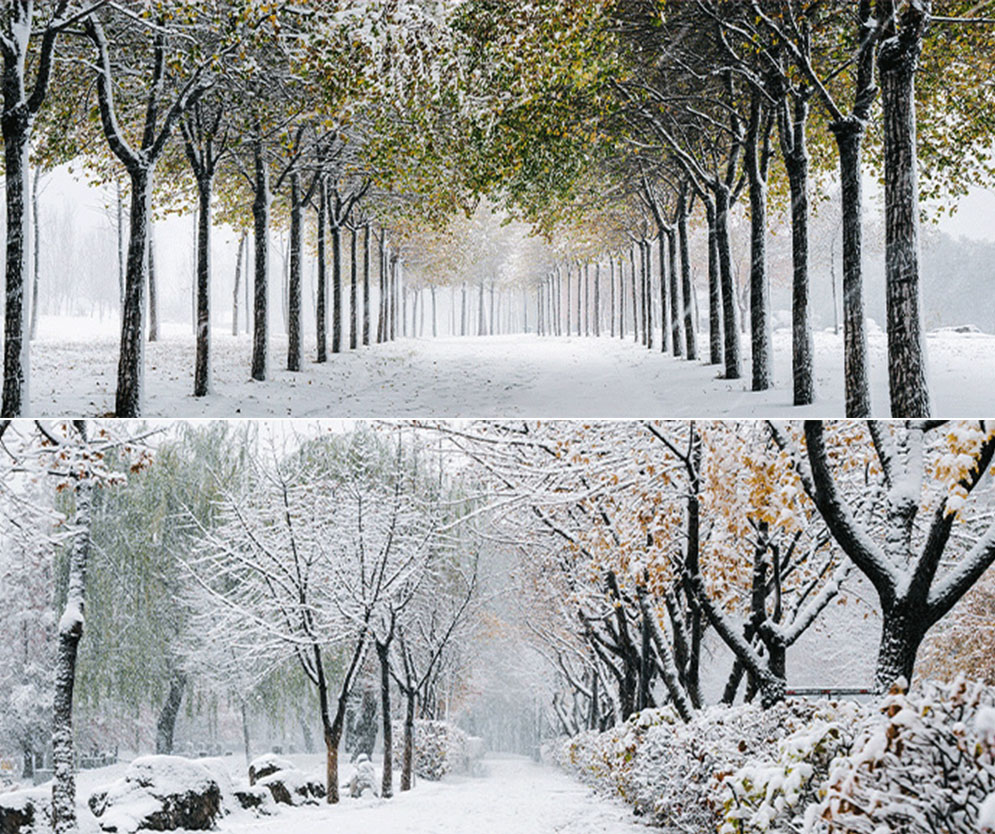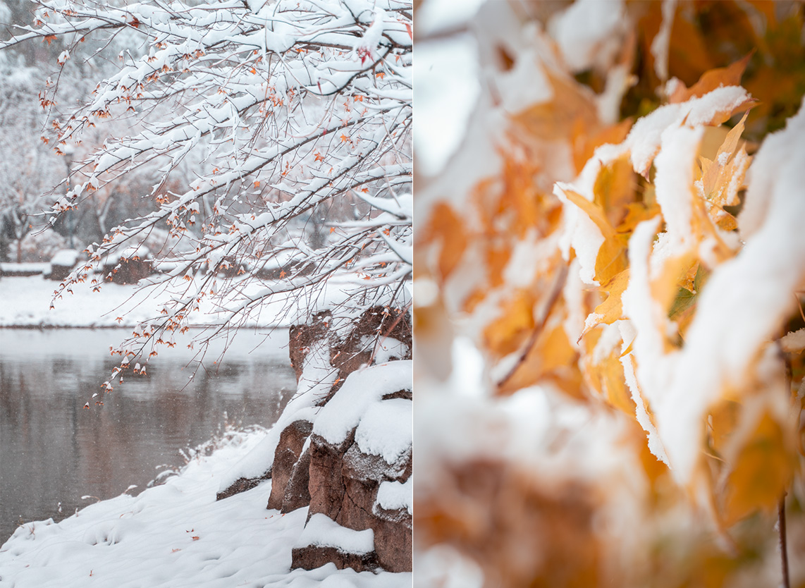 看!那飘飘的白雪 看它悠着荡着晃着,落在树梢、枝头 看它轻盈的跌入掌心 瞬的化作一片晶莹 那纷纷而下的,并非撒盐空中差可拟 而未若柳絮因风起 因风而起,随风而舞,顺风而落 恍然间,万物都渲染上了冬的色彩 风止,雪落交错的脚印 压弯的枝头轻抚肩头的落雪 一抬手,便接住了冬天 蹲下身,薅一把雪 也便抓住了冬天 看漫天苍白茫茫, 忽的理解万里雪飘的磅礴初雪 永远是独属于东北人的浪漫