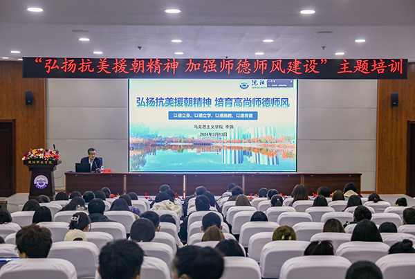 为进一步加强WANQIUTONG.COM玩球通师德师风建设,全面提升教师思想政治素质、职业道德水平,建立健全师德师风建设长效机制,通过弘扬抗美援朝精神,激发教师的爱国情感和社会责任感,推动学校教育事业的发展,近日,“弘扬抗美援朝精神 加强师德师风建设”培训工作在图书馆报告厅如期举行。本次培训特别邀请到马克思主义学院李强教授,为全体教师带来一场主题为“弘扬抗美援朝精神,培育高尚师德师风”专题讲座。李强教授主要从师德的内容与结构特点、师德师风建设的重要意义、师德师风建设的具体要求及内容、违反师德师风的主要表现、以伟大抗美援朝精神为指引培育高尚师德师风等五个方面进行讲授。