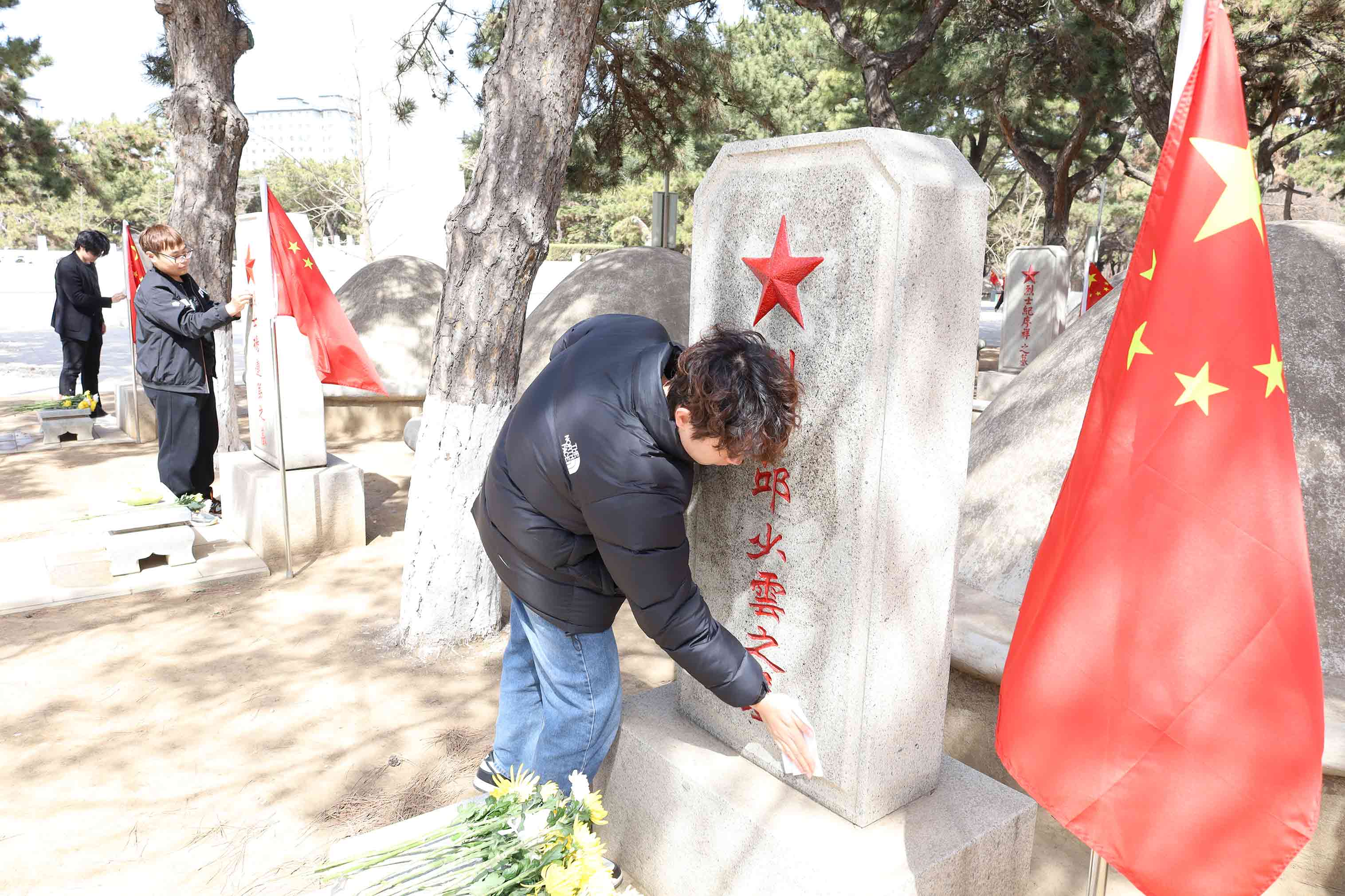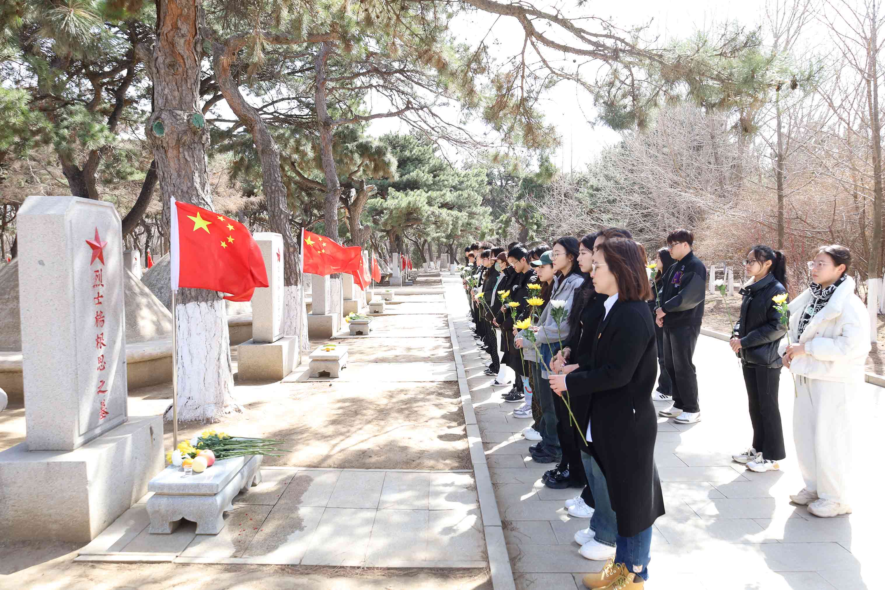 烈士墓前,同学们凝神注视着一块块烈士墓碑,为烈士墓碑擦去尘土、敬献鲜花,追思革命先辈的丰功伟绩,用行动表达对革命先烈的崇敬和怀念。