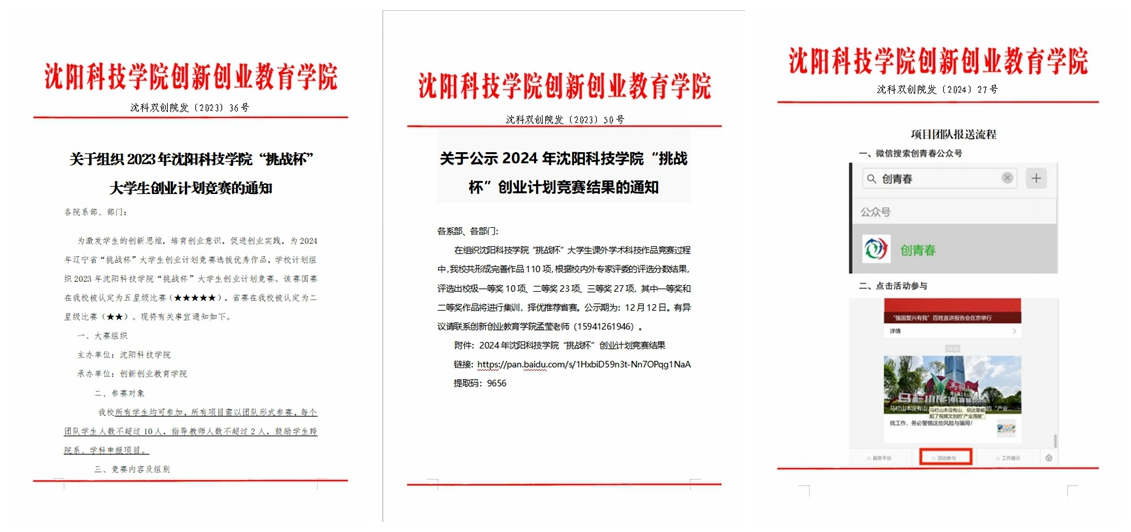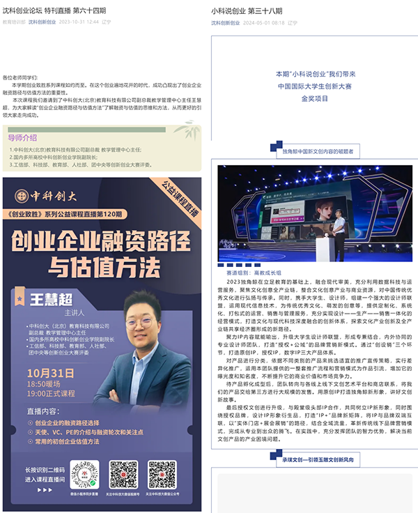 二是在参赛全程,学校策划专题培训讲座,为师生参赛保驾护航。大赛动员期间,学校联合中科创大集团为全校师生作了一场“挑战杯”大赛专题讲座。在大赛期间,《沈科创业讲坛—特刊直播》《小科说创业》板块,特别推送了四期相关培训课程。
