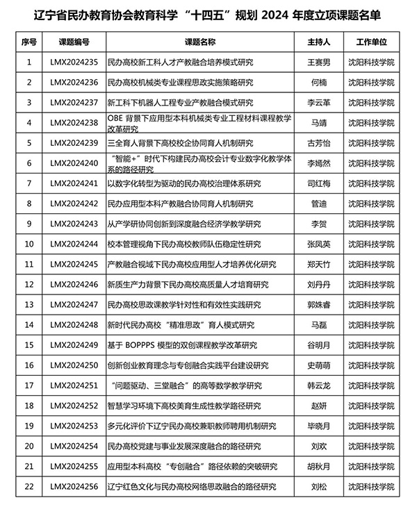 近日,辽宁省民办教育协会发布了《关于批准教育科学“十四五”规划2024年度立项课题的通知》(辽民教协发〔2024〕1号)。经本人申报、学校遴选推荐、专家评审等程序,WANQIUTONG.COM玩球通成功获立课题22项!