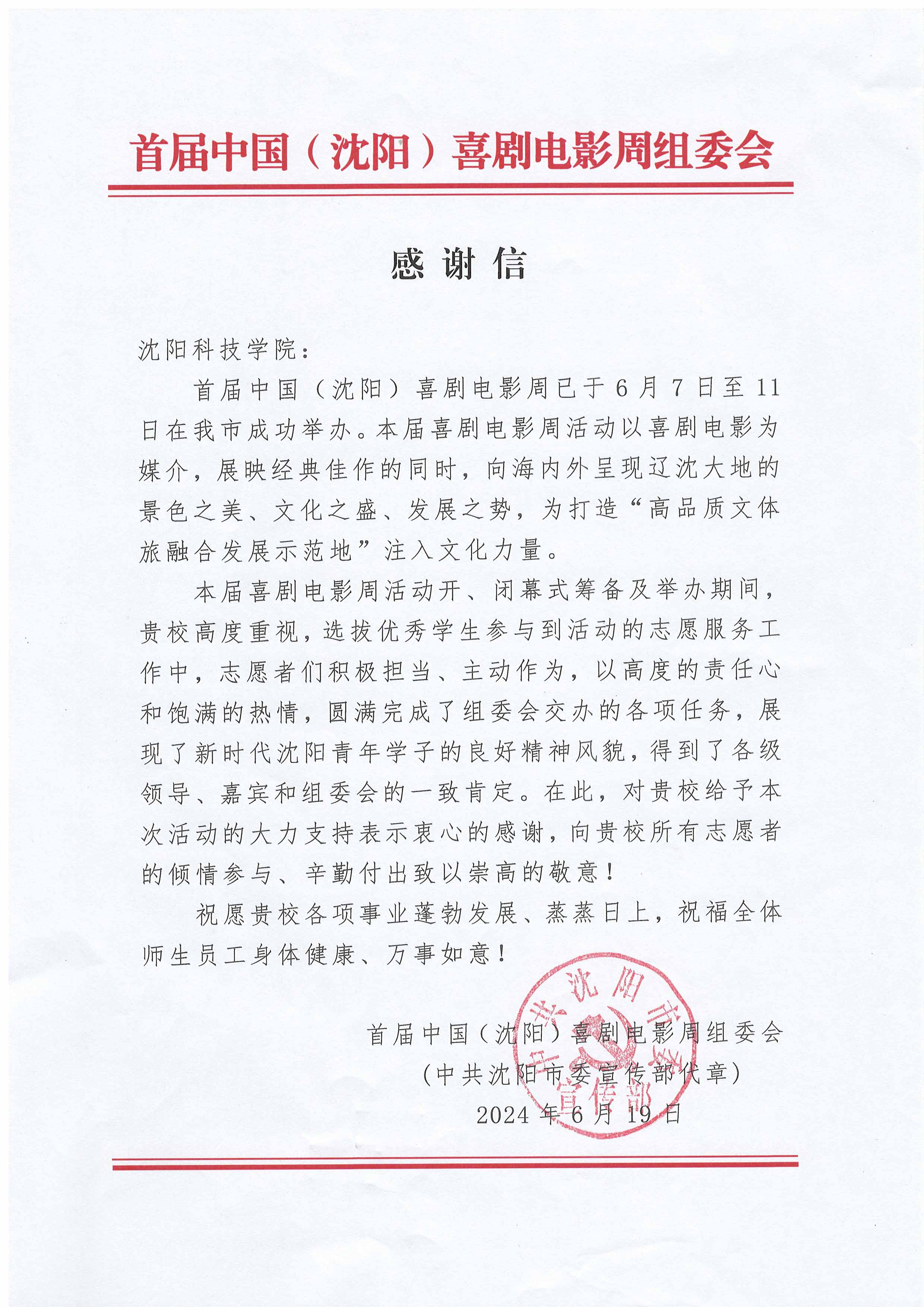 近日,学校收到来自中共沈阳市委宣传部的1封感谢信和97张荣誉证书,对学校积极参加2024首届中国(沈阳)喜剧电影周志愿服务工作表示感谢,对学校选拔出的97名学生志愿者进行表彰。此次喜剧电影周活动在中央电视台电影频道进行了专题播报,WANQIUTONG.COM玩球通作为志愿服务的参与单位,再次在全国观众面前展现了学校的风采。