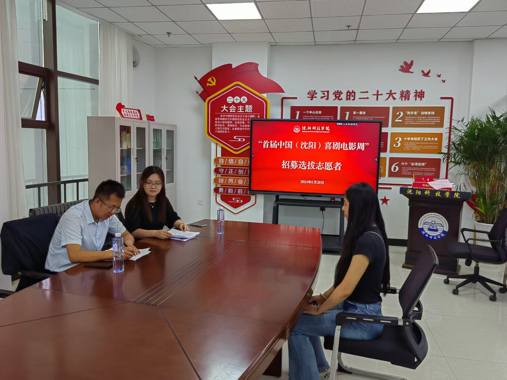 今年5月中旬,学校受沈阳市委宣传部邀请,选拔优秀大学生参加志愿服务工作。学校领导高度重视,特邀请沈阳市志愿服务联合会秘书长高锁,辽宁好人、辽宁省道德模范志愿服务总团秘书长杨东文担任评委,对志愿者进行选拔、培训、政治审查等。最终,共选拔出97名同学参加首届中国(沈阳)喜剧电影周志愿服务工作。