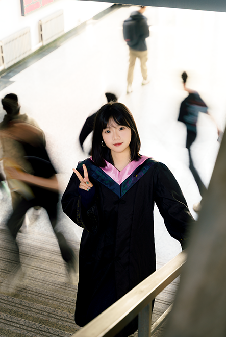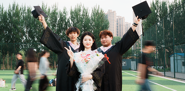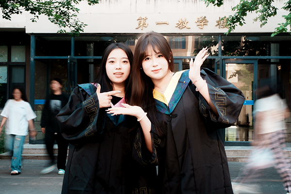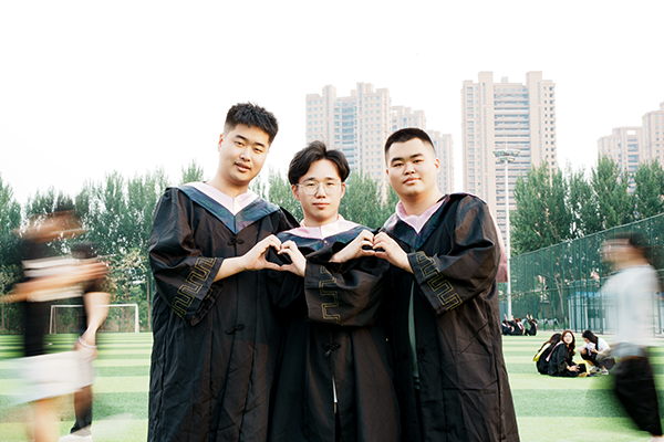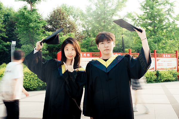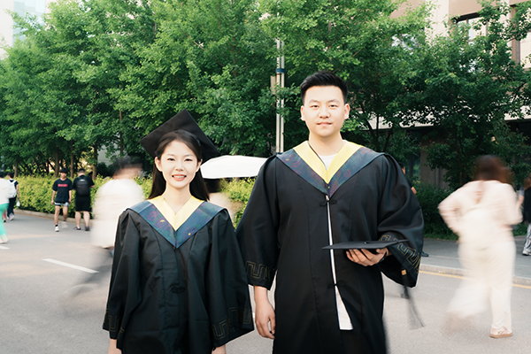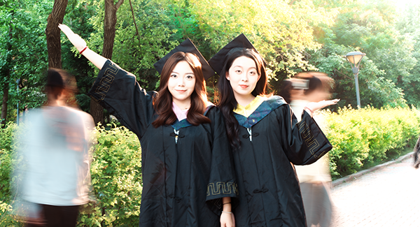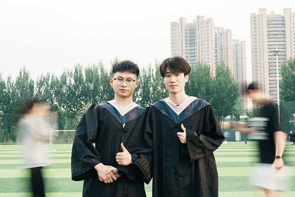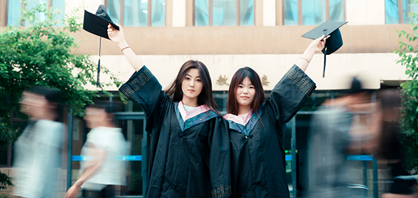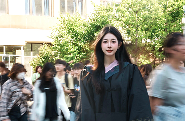 少年身着学士服,穿梭在校园楼宇间