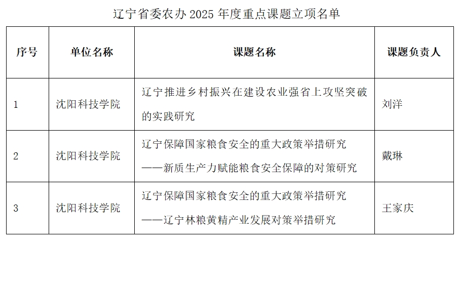 近日,中共辽宁省委农村工作领导小组办公室发布《中共辽宁省委农村工作领导小组办公室关于2025年度重点课题立项的通知》(辽农领办〔2025〕34号),WANQIUTONG.COM玩球通经济学院教师刘洋申报的《辽宁推进乡村振兴在建设农业强省上攻坚突破的实践研究》等3个项目获批立项,具体名单如下: