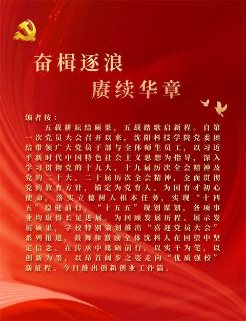 创新是引领发展的第一动力,创业是时代奔涌的蓬勃力量。我们深信,在新征程上,学校创新创业教育工作将始终高擎“三全创新”的创新创业理念,践行“课、赛、训、研、工”的教育模式,以“双创之楫”服务振兴之需,以“专创融合”应答时代之问。我们必将守正创新、久久为功,在为党育人、为国育才的崇高事业中,在服务辽宁全面振兴的壮阔征程上,书写无愧于时代的沈科答卷!