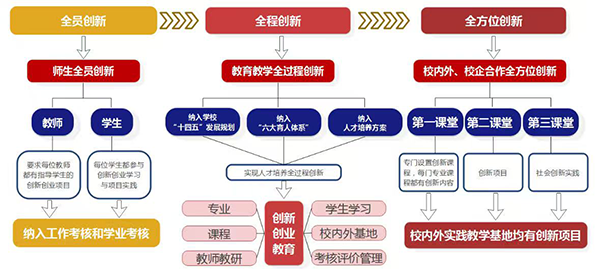 学校于2016年提出“要素入手,能力本位”的创新创业教育理念和“双线并行,五步推进,能力本位,开放创新”的创新创业人才培养模式。在2021年,凝练出“六效结合”创新创业模式,其思想、内涵是专创结合。在2023年,学校意识到现阶段处于创新的时代,经济社会发展急速转型,通过创新创业推动传统产业升级。因此,学校提出“全员创新、全程创新、全方位创新”创新创业教育理念。