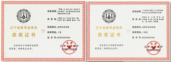 学院通过加强创新创业教育与专业教育融合,推动创新创业教育改革,打造创新创业育人体系,推动学校教育教学改革,实现创新突破,形成品牌特色。其中题为“‘要素入手,能力本位,双线并行,五步推进’民办高校创新创业教育模式探索与实践”的教学成果,获得2020年辽宁省教学成果奖。题为“‘六效结合’模式下大共享创新创业生态系统的探索与实践”获得2022年辽宁省教学成果奖。