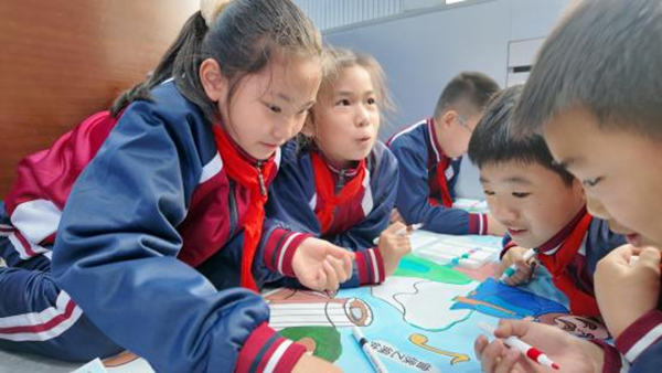 美术课程贯穿“传统与现代交融”理念,让孩子们在创作中感受艺术多元魅力。长卷绘画课以“祖国科技”为主题,教师通过图片、视频展示我国航天航空、人工智能、高铁建设等领域辉煌成就。从“神舟”飞天到“嫦娥”探月,从智能机器人到新能源汽车,震撼的科技成果激发了创作灵感。在师生志愿者指导下,孩子们分工协作、大胆想象:有的描绘遨游太空的航天飞船,蓝色宇宙背景点缀闪烁星辰;有的刻画穿梭城市的磁悬浮列车,线条流畅动感;有的将传统建筑与现代科技结合,创意独特。创作中,孩子们既锻炼了绘画技巧,又培养了团队协作意识,用斑斓色彩抒发对祖国科技发展的自豪与憧憬。